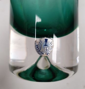 Collection of coloured and engraved glassware, including four green tinted small wine glasses in sizes, a green and clear tinted Murano-style cylindrical vase, assorted cut glass vases including a late 19th century example, a large green-tinted controlled bubble paperweight, an amethyst-tinted  model of a duck and other items