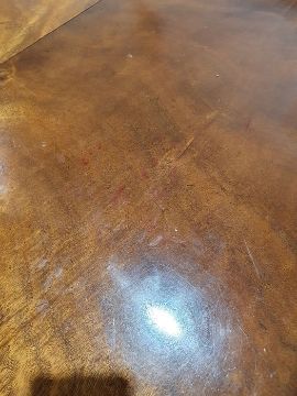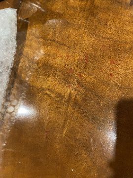 Surface scratches and scuffs to the wood. Eight clips are all present and correct. Light marks to the surface including water marks. Red pen to the centre of the surface. Areas of fading and discolouration. General edgewear.