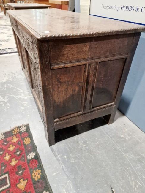 Possibly 17th century and later oak coffer, the rectangular top with moulded front edge, above three front foliate carved panels, on style supports, 69cm x 135cm x 55cm