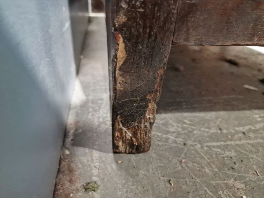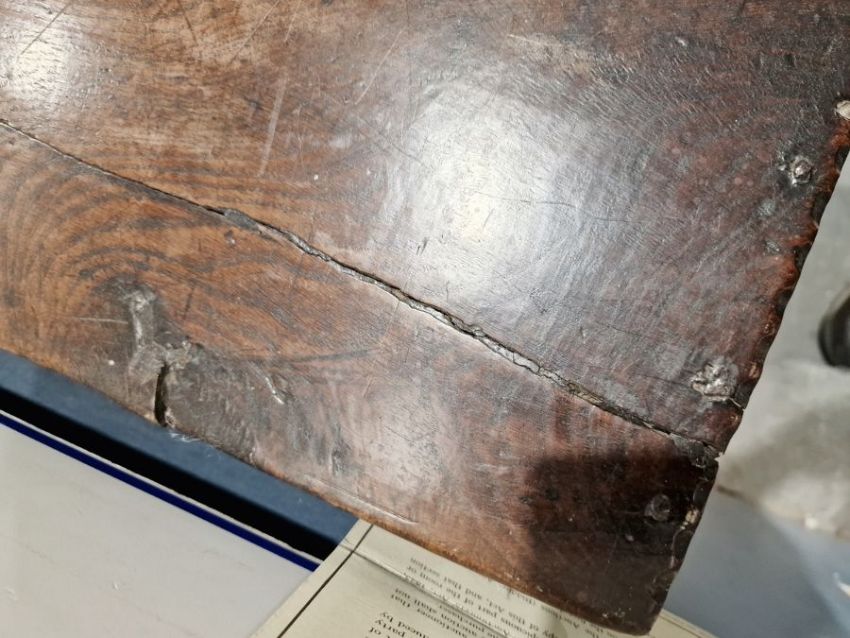 There is a large amount of wear to the back foot. The top has several cracks and other damage to it. The area near the lock appears to have been repaired. There are a few coffee cup stains to the top. Please see additional images.