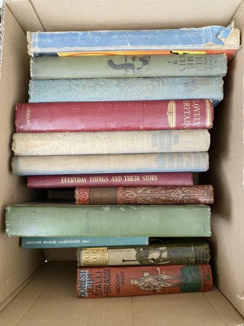 " Mickey Mouse in King Arthur's Court - with Scenic Illustrations"  Dean & Son, printed with permission of Mr Walter E. Disney, the pop-ups ( 4) some sellotape repairs, sadly the book has been coloured- in throughout , hinges cracked, back strip separated but present, the pictorial boards bumped and rubbed,  Greenaway Kate,  " Little Anne" Frederick Warne and Co. col. ills throughout, pictorial half title, yellow endpapers, inscription dated 1906, quarter cloth, pictorial boards, binding tight,  Rudyard Kipling " The Jungle Book "  MacMillan & Co. 1937, Library Edition, red cloth , gilt dec to front board, dust jacket ,  " The Second Jungle Book"  MacMillan & Co. 1940 , Library edition, red cloth with gilt dec to front boards, , dust jacket assorted other volumes, to include Annuals, King Penguins, Blackie and Son  ( 5 boxes)