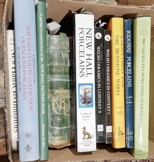 Godden, Geoffrey A " Newhall Porcelain" The Antique Collector's Club, " Minor Masons ,China and the Ironstone wares" The Antique Collector's Club,  " Ridgeway Porcelains" the Antique Collector's Club,  " Catalogue of the Lady Ludlow collection of English Porcelain", Hurlsbutt "Bow Porcelain", G Bell and Sons and other related volumes ( 2 boxes)