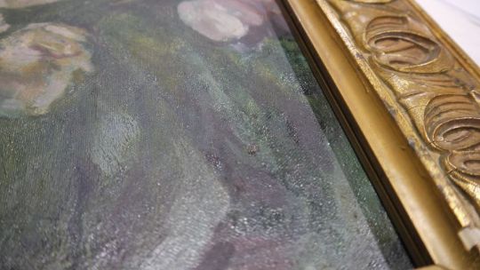 20th century school Oil on canvasStill life study of roses and tulips, unsigned, 39cm x 49cm Condition ReportCracking throughout painting surface especially to left half. Some dark marks that appear to not be original to painting. Some sticky residue to loweer right of surface. Frame heavily worn including chips, scratches and losses.