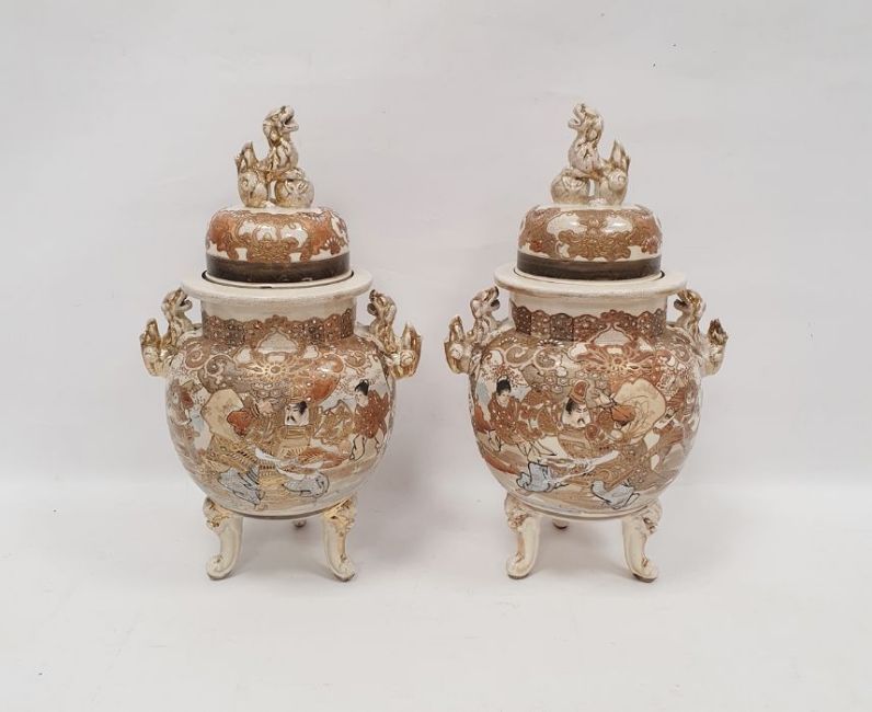 Pair of Japanese Satsuma vases and domed covers, early 20th century, painted in gilt with flowers within brocaded borders with lion dog finials and handles raised on mask and scroll feet, 37.5cm high (some damage)