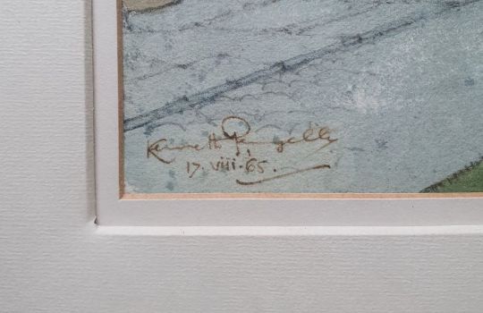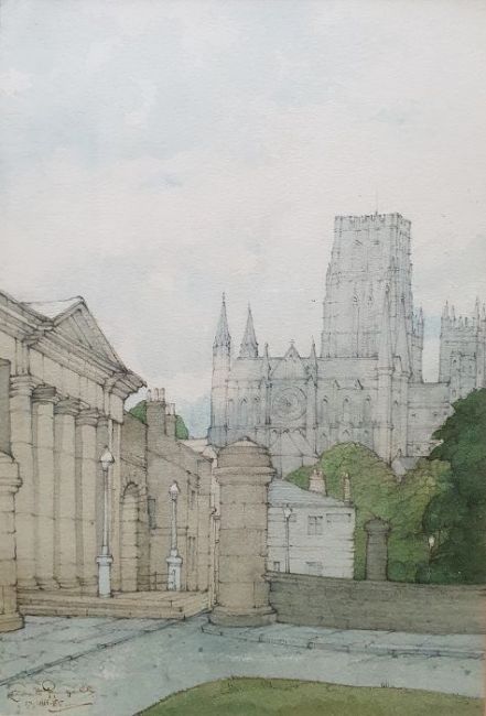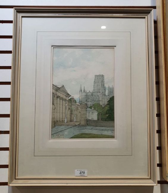 Kenneth Pengelly (20th century) Watercolour drawingCathedral with Roman-style portico building to left, signed and dated 17.VIII.'65, 28cm x 19cm