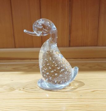 Whitefriars glass "Dilly Duck" model designed by Geoffrey Baxter with controlled bubbles in clear glass, 15cm high