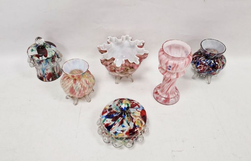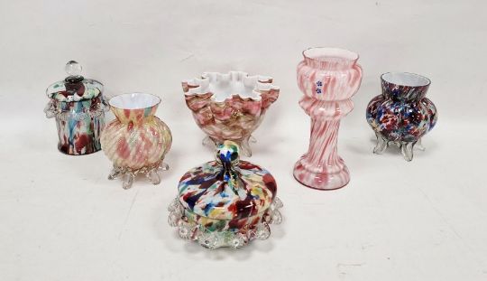Collection of Franz Welz Bohemian spatter glass, late 19th/early 20th century including a pink and white vase on pedestal with enamelled blue flowers, 18cm high, a riband moulded vase with gold aventurine raised on feet, a jar and cover and a powder box and cover with flowerhead and shell frill border, a lobed vase similar raised on feet all splattered in red, blue, green and yellow and a pink and brown splattered spill vase raised on feet