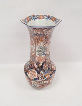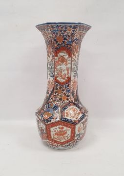 Late 19th century Imari faceted baluster vase, with tall flared neck, painted with panels of precious objects, shrubs, trees and dragons, 44.6cm high