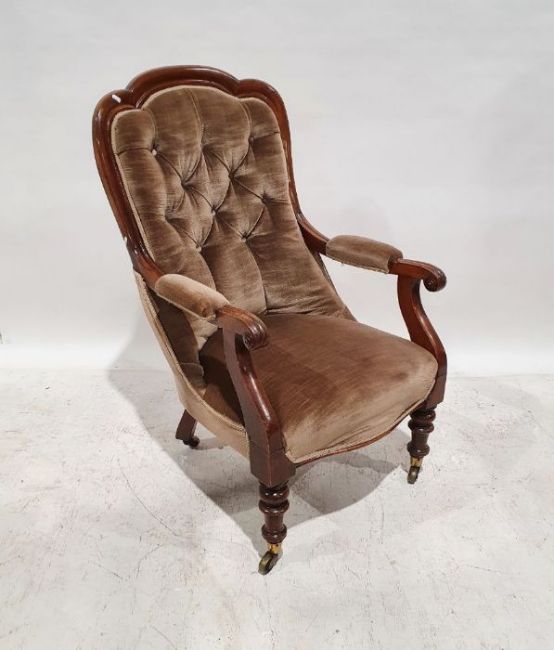 19th century armchair with brown upholstered seat, back and arm rests, turned front legs