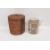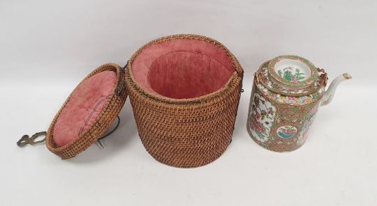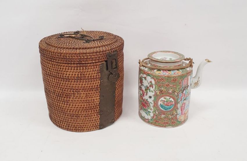 Cantonese porcelain cylindrical teapot and cover in a wicker basket, painted in the famille rose palette with cartouches of figures in conversation and flower sprays with wicker handle fitted in a cylindrical red silk-lined brass bound wicker basket, 27cm high overall