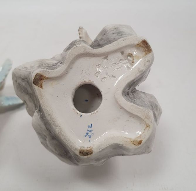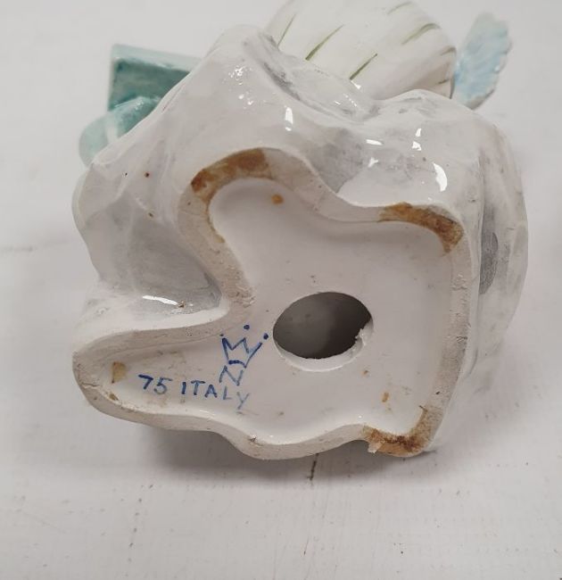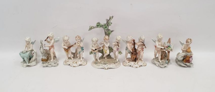 Seven early 20th century Italian Capodimonte porcelain figures of putti at various pursuits, painted blue ground urn marks and Italy marks, playing musical instruments, painting, sculpting and making pottery, all on shell scroll moulded bases, 20.5cm high (7)