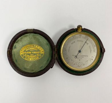 Negretti & Zambra brass cased pocket barometer, the silvered dial marked 20505, in leather case,  (lacking inner ring), 4.6cm diam.