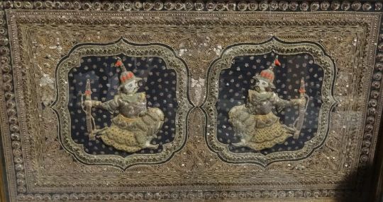 Eastern-style needlework panel with two figures bearing swords, set in gold-coloured threaded intricate needlework and sequinned and semi-precious jewelled border, 57cm x 99cm