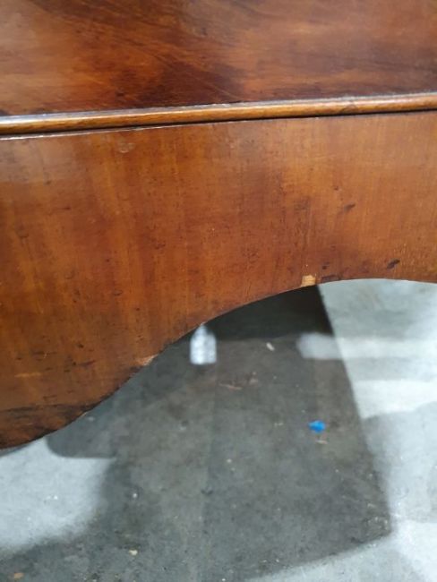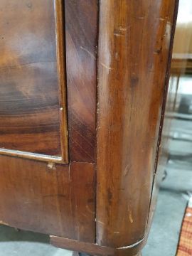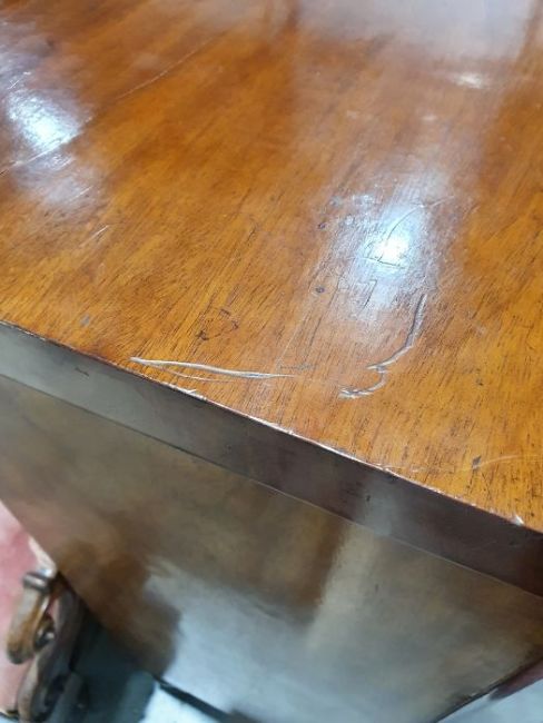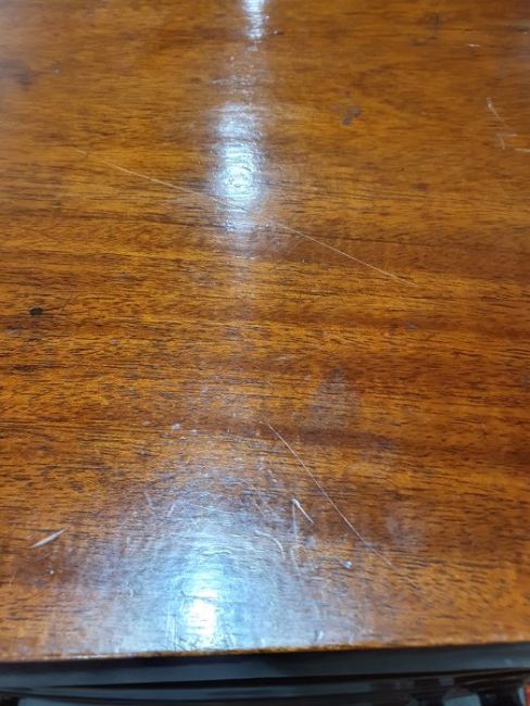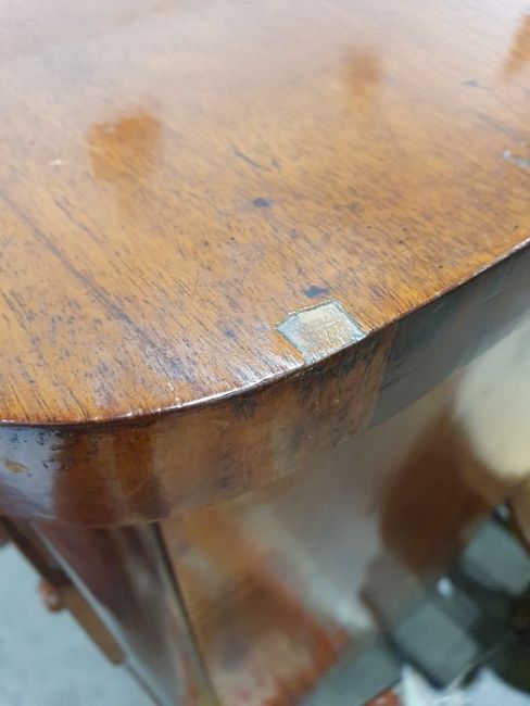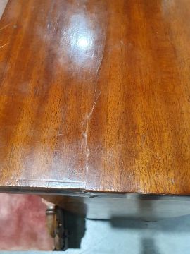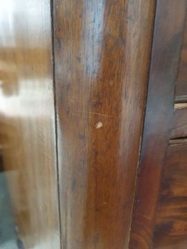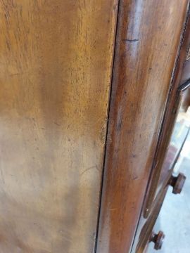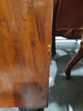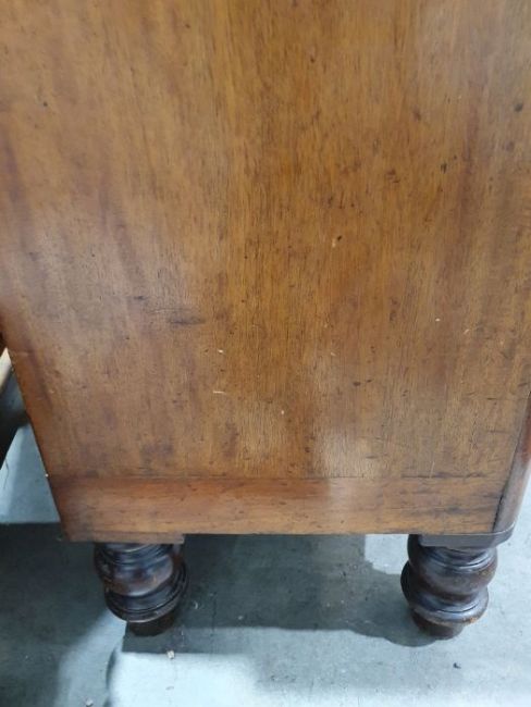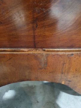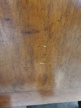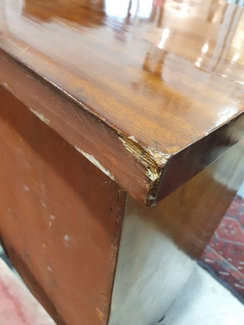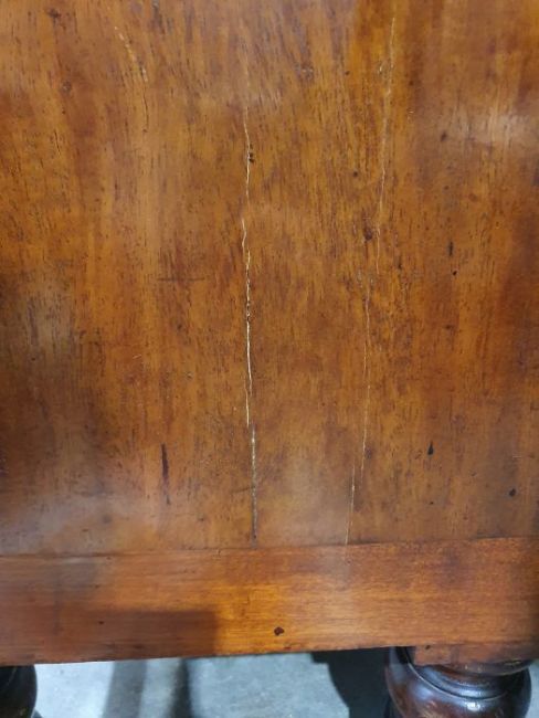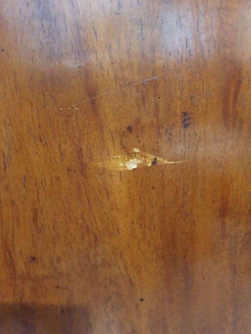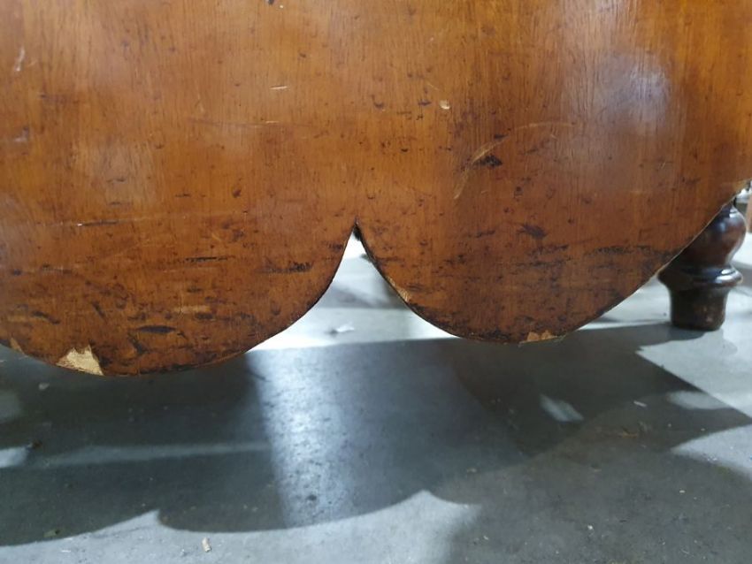 Surface scratches, scuffs and knocks to the wood. Areas of loss to the veneer, some small chips. Some splits to the top and side. Light fading, discolouration and staining in places. General wear and tear.