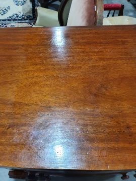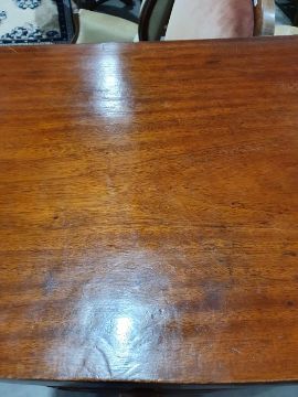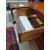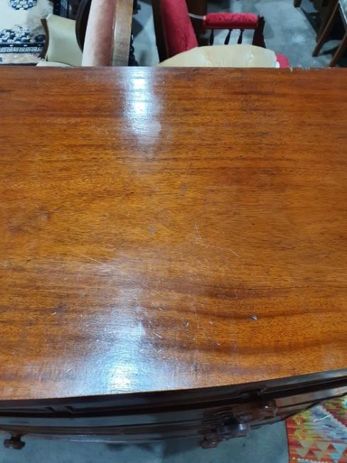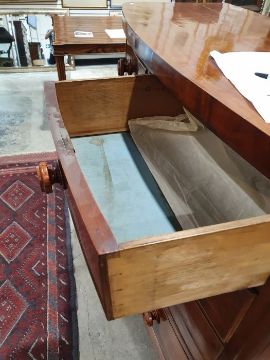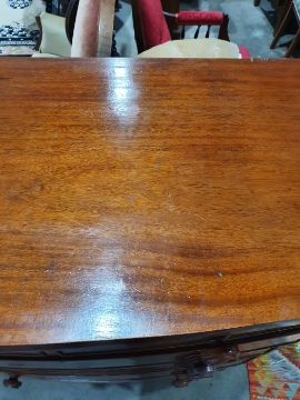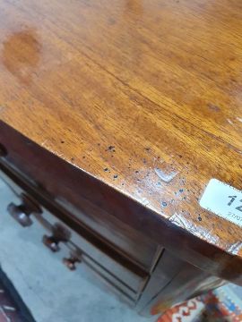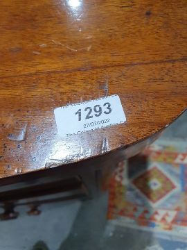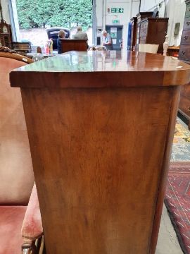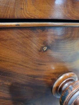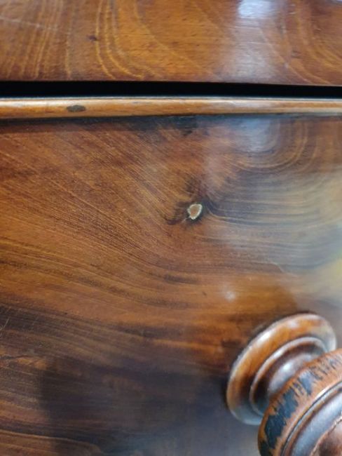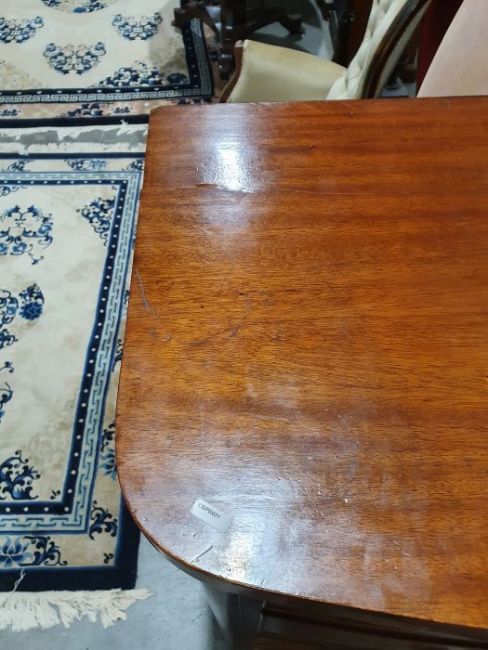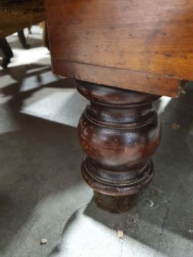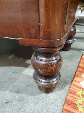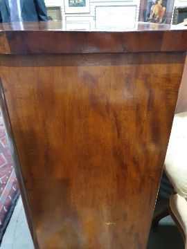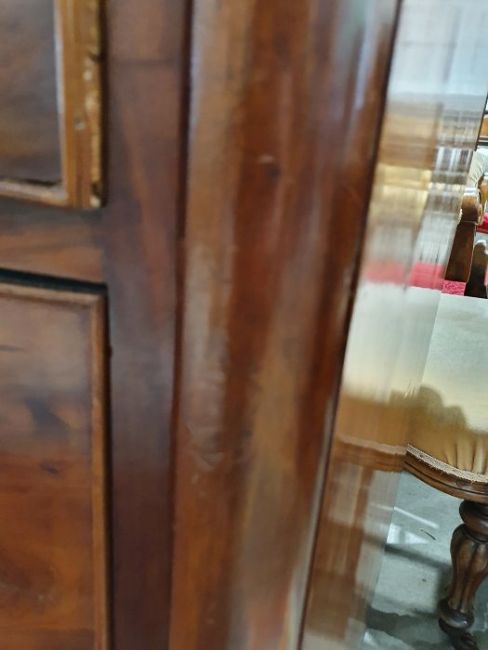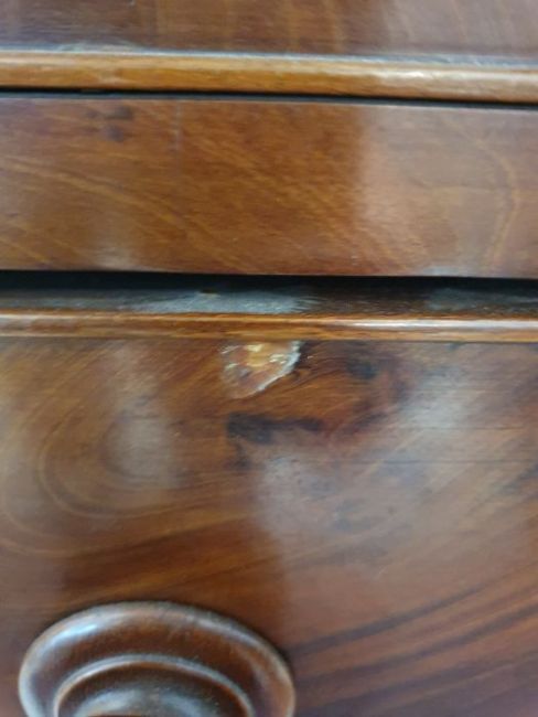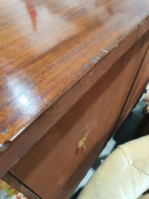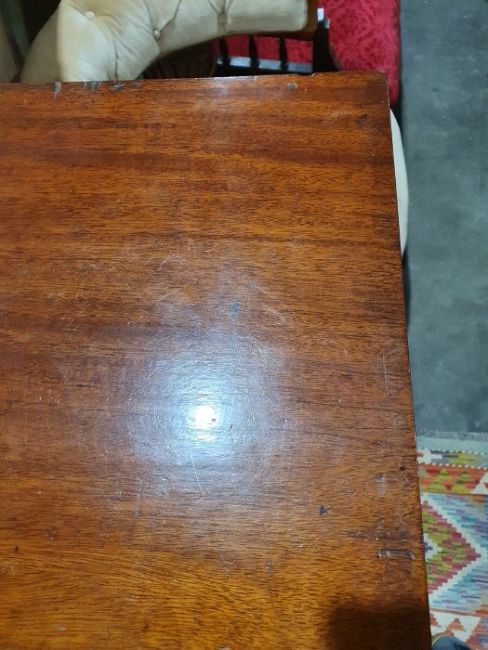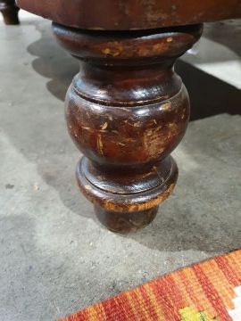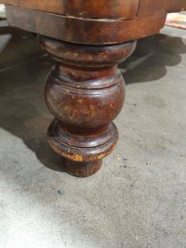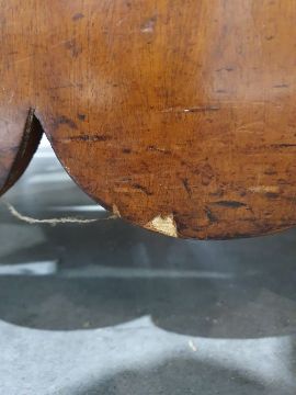 Surface scratches, scuffs and knocks to the wood. Areas of loss to the veneer, some small chips. Some splits to the top and side. Light fading, discolouration and staining in places. General wear and tear.