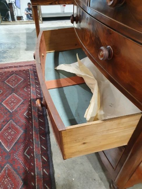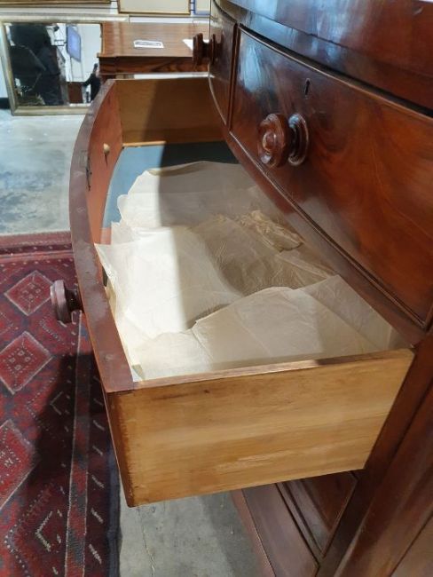 Victorian mahogany bowfront chest of two short over three long drawers, flame veneer to the drawer fronts, on turned supports, 120cm x 120cm x 52cm