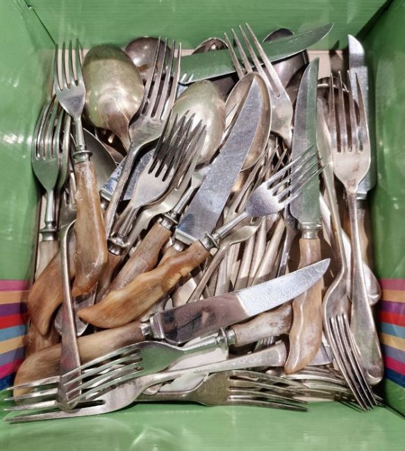 Assorted propelling pencils, a propelling pencil one end and a seal the other, other seal stamps, a Parker fountain pen, green lacquer and a pen tray, ebony wood draughtmans measuring stick  and small quantity flatware (1 box)