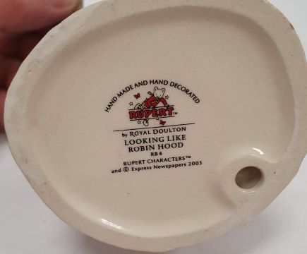 Five Royal Doulton figures of 'Rupert the Bear' and two Beswick 'Rupert' models similar, the Doulton examples titled 'We Meant to Put Them Back', 'Leading the Way', 'Rupert's Silver Trumpet', 'Looking Like Robin Hood' and 'Finishing Arrows and Stringing his Bow', the Beswick models titled 'Rupert Bear Limited Edition 1769/1920' and 'No.2/2000 Rupert with Satchell' and a Royal Doulton box, tallest model 14cm high (7)
