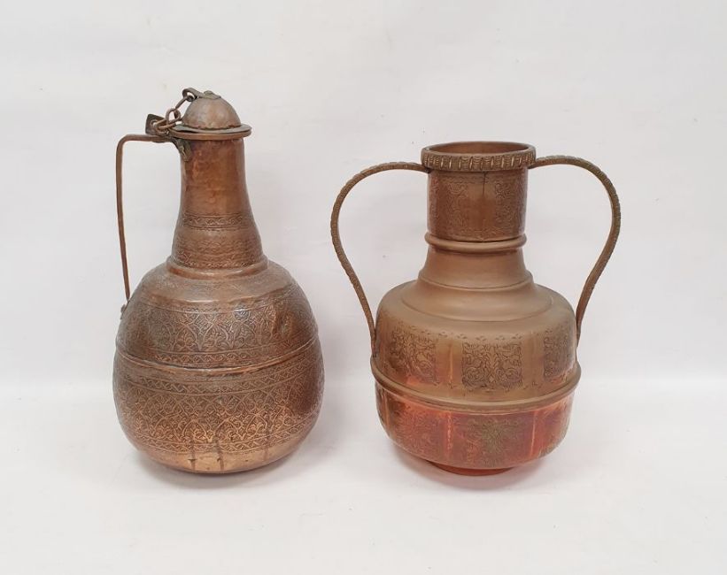 Middle Eastern copper ewer, with hammered design, a single handle, 48cm high approx with a Middle Eastern two-handled vase, also with a hammered design, 42cm, high (2)