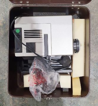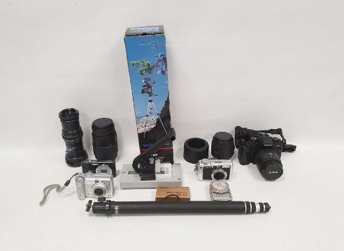 Sigma lens 90mm F2.8 macro in original box, another Sigma camera lens 70/300mm F4-5.6 in original box, a mounting press in original box, an empty camera case and a Sigma camera SA-7, with camera case, a small Pentax camera Opteo 750Z, a small Panasonic camera DNC-FS20 and slide duplicator in original box, a Canon Powershot A75 digital camera, a Vanguard VT-150 tripod, a Zeiss Ikon slide projector in carry case