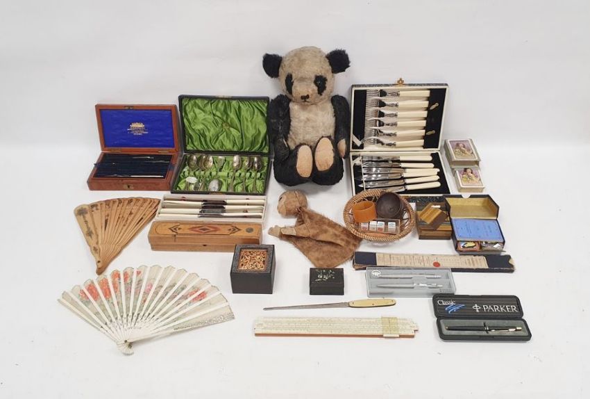 Assorted collectables to include boxed slide rules, playing cards, vintage pencil box, boxed Parker biro and another set, bakelite-handled knives, boxed set of silver-plate teaspoons, bead pattern with a monogram and two vintage soft toys to include a panda bear (1 box)