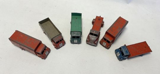 Playworn Dinky diecast model cars to include 2 x Dinky Supertoys 514 Slumberland Guy van, 531 Leyland Comet, 511 Guy 4-Ton Lorry, 513 Guy Flat Truck with Tailboard, 512 Guy Flat Truck (6)