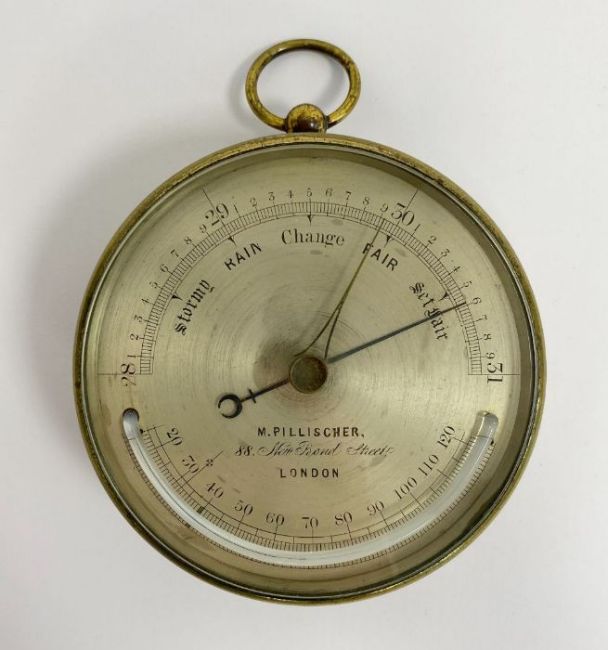 Late 19th century brass-cased barometer by M Pillischer, with thermometer, the silvered dial marked with M Pillischer/88 New Bond Street, London, 9.5cm diam.