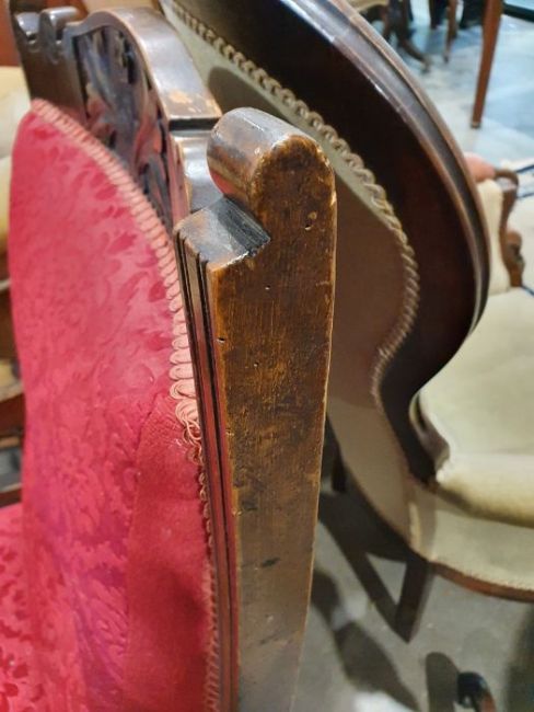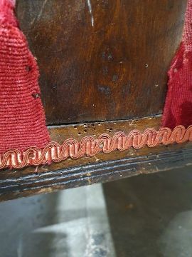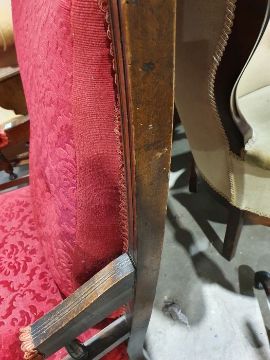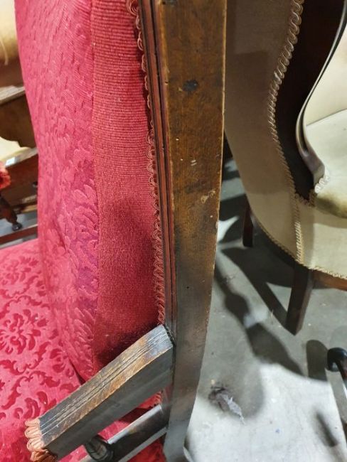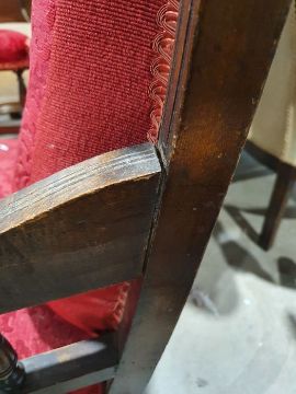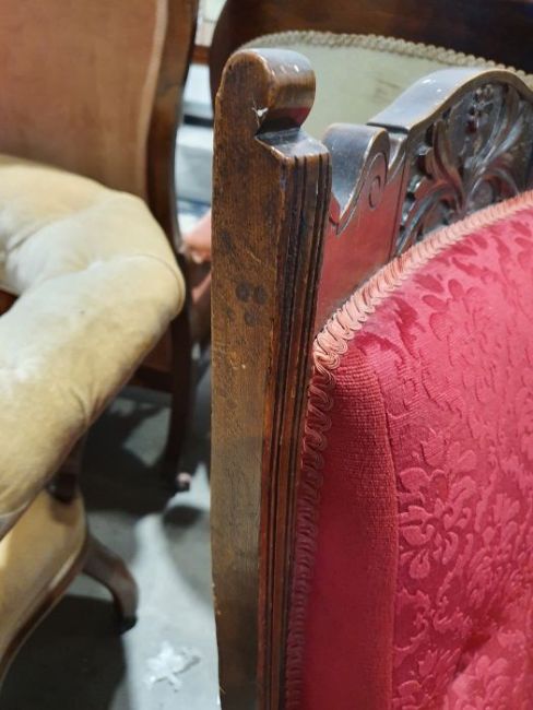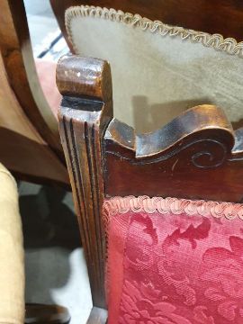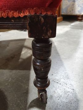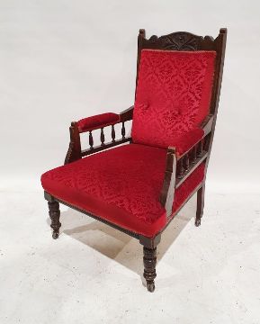 Late Victorian/Edwardian armchair with red upholstered seat, back and armrests, on turned and ringed front legsCondition ReportSurface scratches, scuffs and knocks to the wood. Old worm in areas, joints slightly loose with some seperating.  Upholstery appears in good order with some wear. General wear and tear.
