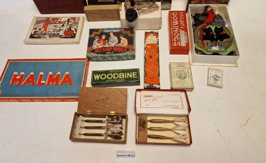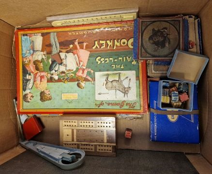 Box board games, Jigsaws, Dominoes to include 'The game of the Tail-less Donkey' , 'Higgledy- Piggledy', 'Pell Mell' club set, Railway Dominoes, 'The Victory' Jigsaw puzzle, Will's woodbine dominoes, Genuine Lumar jigsaw puzzles and two sets of darts, etc (1 Box)