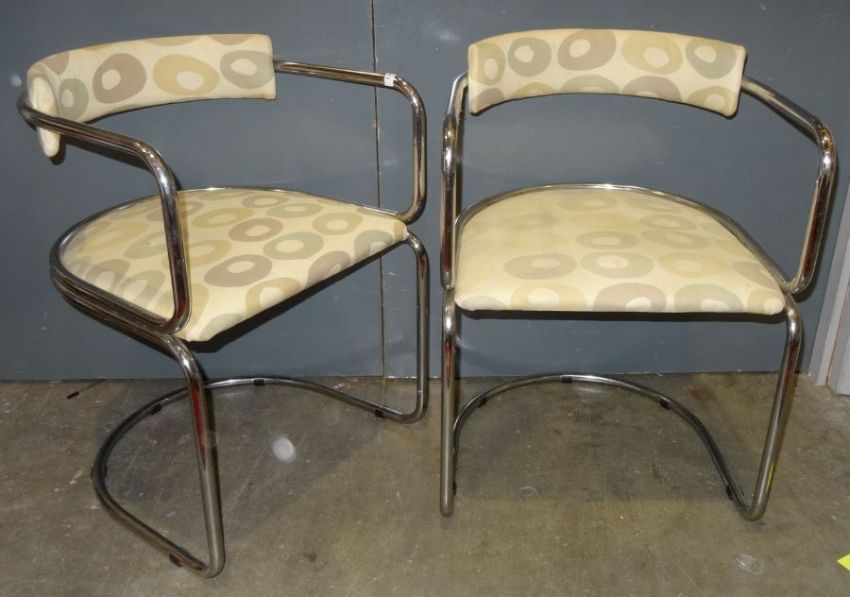 In the manner of Gastone Rinaldi set of six tubular chrome cantilever dining chairs in a light ground upholstered seat and back with stylised oak decoration (6)