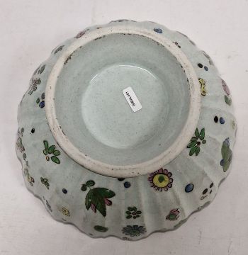 WITHDRAWN Chinese clobbered pedestal bowl with scalloped border, underglaze blue and enamel decoration of chrysanthemums, dragons and precious objects, 26cm diameter