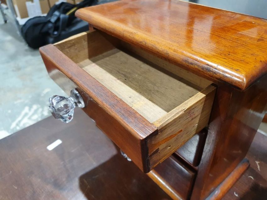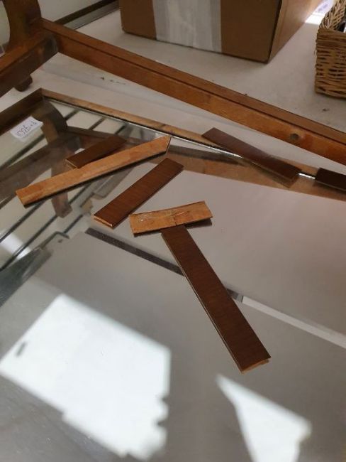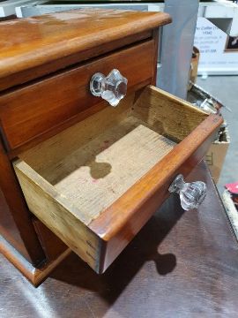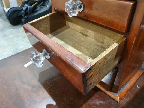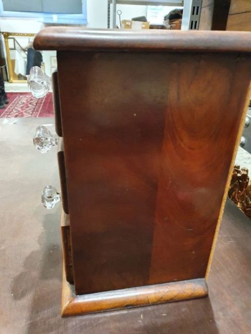 Chests have light surface scratches, marks and scuffs. areas of fading and discolouration, some staining inside the drawers, split to the bottom of one of the drawers. Mirror has scratches and scuffs, numerous sections of the venneer have detached, some splits to the wood.