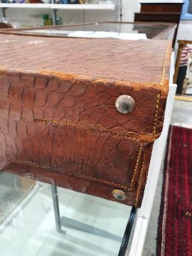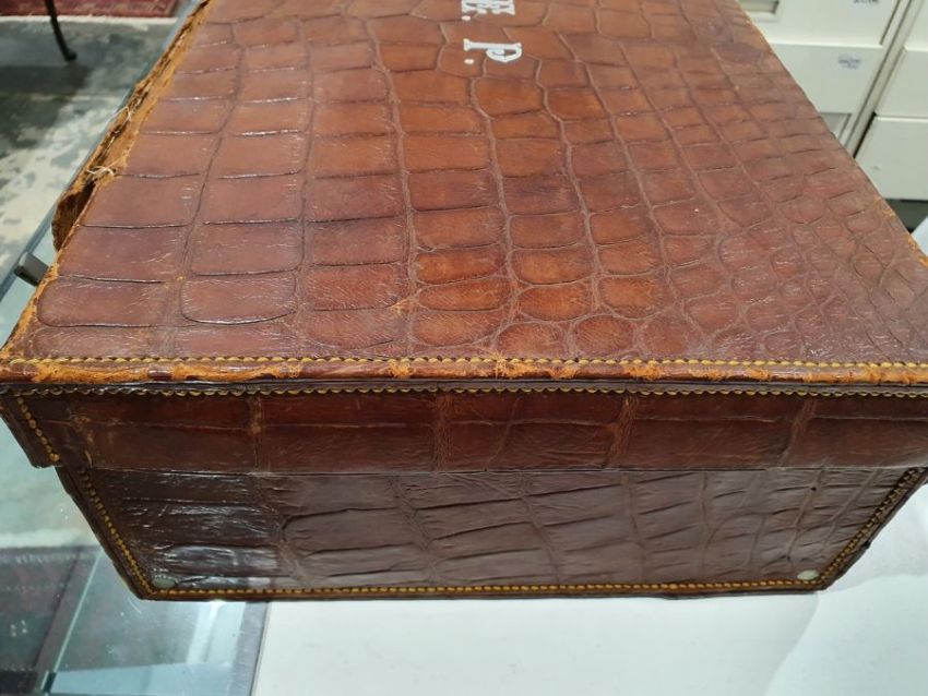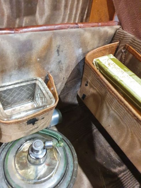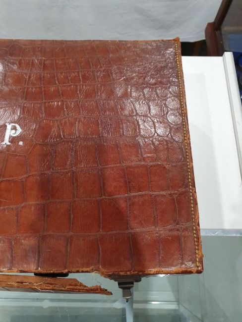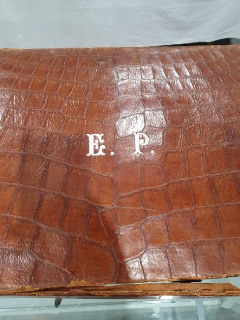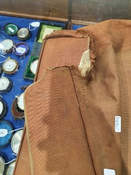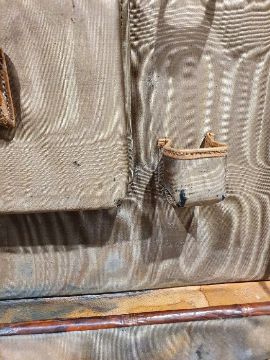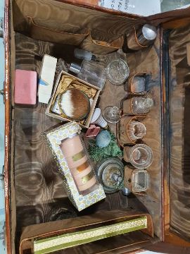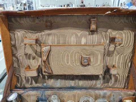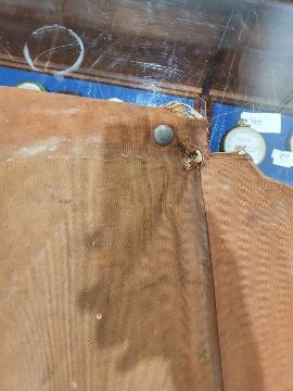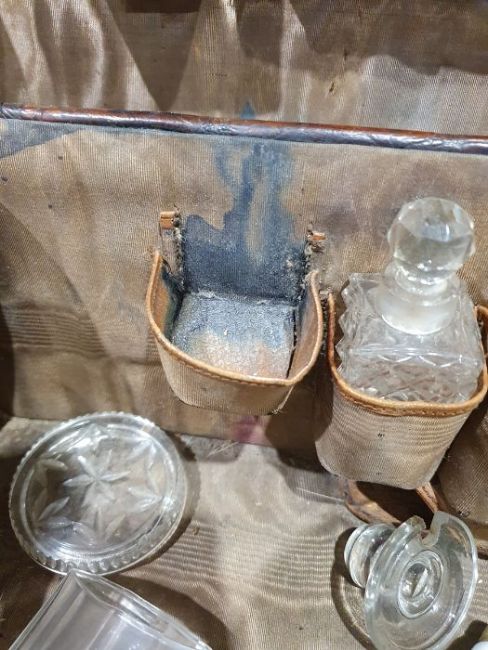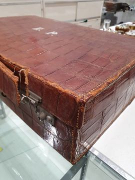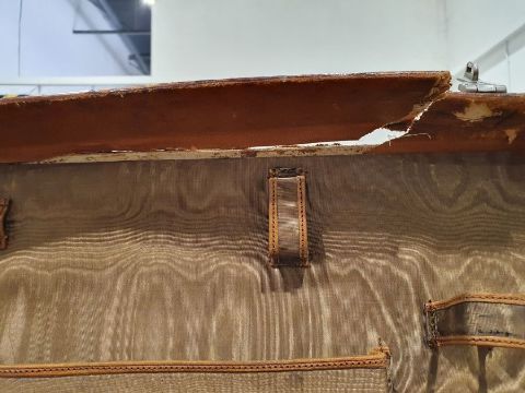 Surface scratches and scuffs, areas of fading and discolouration, split to the front of the lid, staining, loose threads and some tears to the silk lining. Rips and stains to canvas outer.
