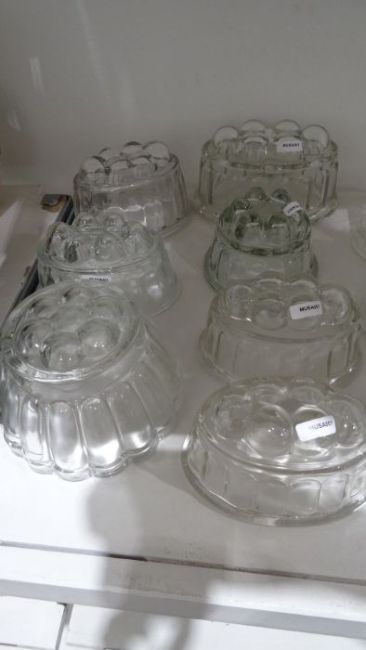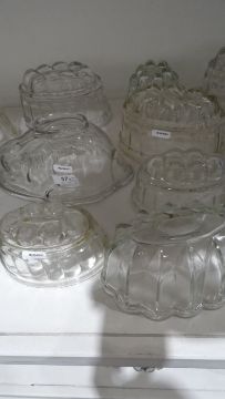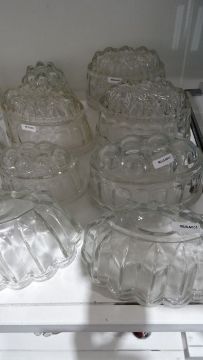 Collection of twenty-one glass press-moulded jelly moulds, in various designs including a rabbit, 21cm wide, foliate and traditional lobed designs, some with moulded British make to rim
