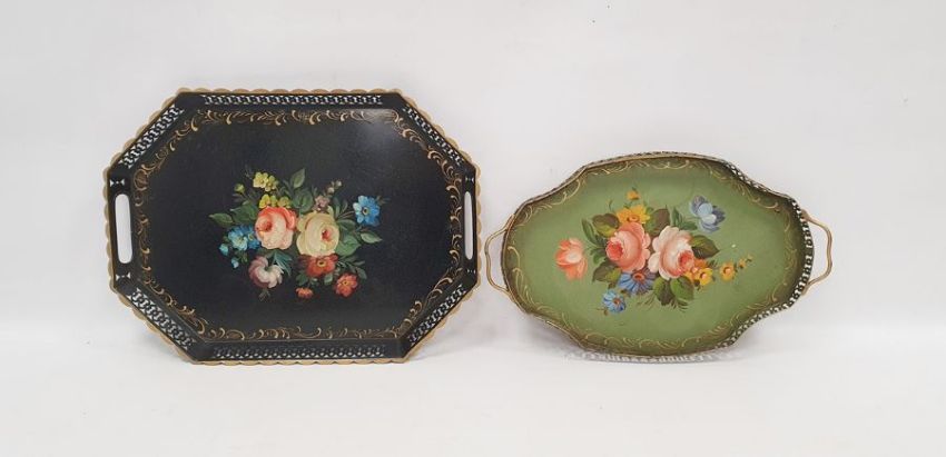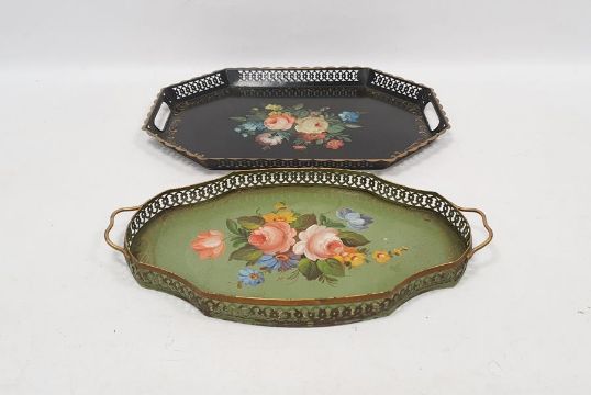 Two tin trays decorated in the Barge fashion, both with galleried edges (2)