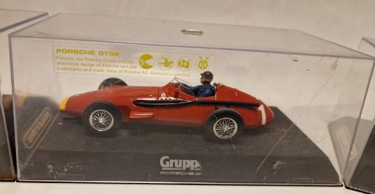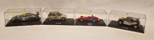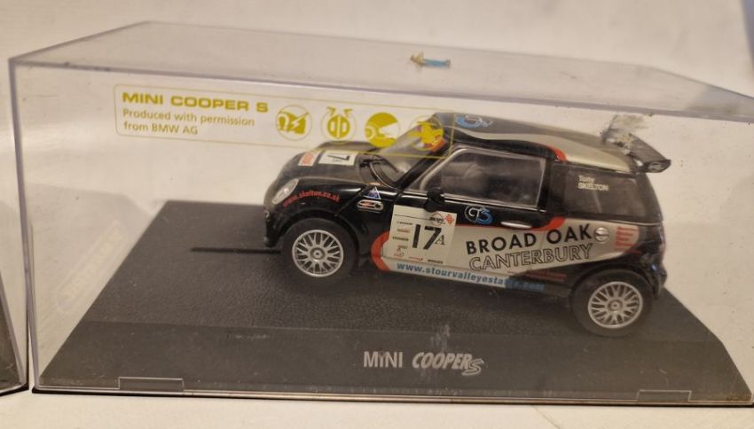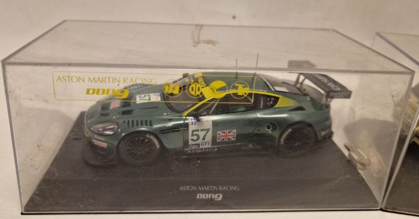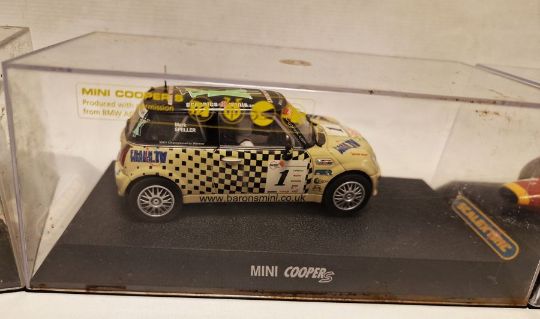 Four cased Scalextric slot cars to include Mini Cooper S Marked 17A, Mini Cooper S marked 1, Aston Martin Racing DBR9 and Porsche GT3R (4)