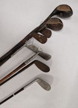 Small quantity of vintage golf clubs to include a J Morris Special 8 iron, a Jazz Lillywhite 8 iron with hickory shaft, a Gordon Lockhart 3 iron, a J Morris 5 iron, a Prestwick putter, a J Morris 2 iron, a J Morris Carnousty driver, a further driver and a vintage golf bag (8)