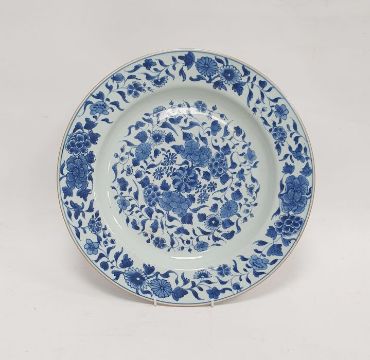 18th/19th century Chinese porcelain charger with underglaze blue decoration of scrolling foliage, peony and other blossoms, 36cm diameter (hairline crack to rim)Condition Reportsurface scratches/wear, no apparent restoration - please note not looked at under UV light.