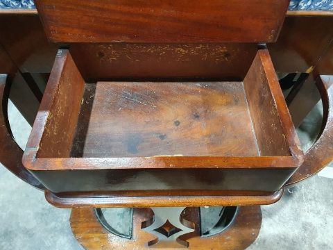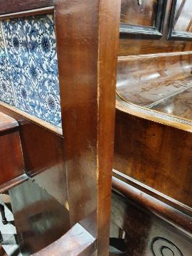 Surface scratches, scuffs and knocks to the wood. Areas of loss to the veneer. Two pegs are missing, some splits to the wood. areas of fading and discolouration. General wear and tear.