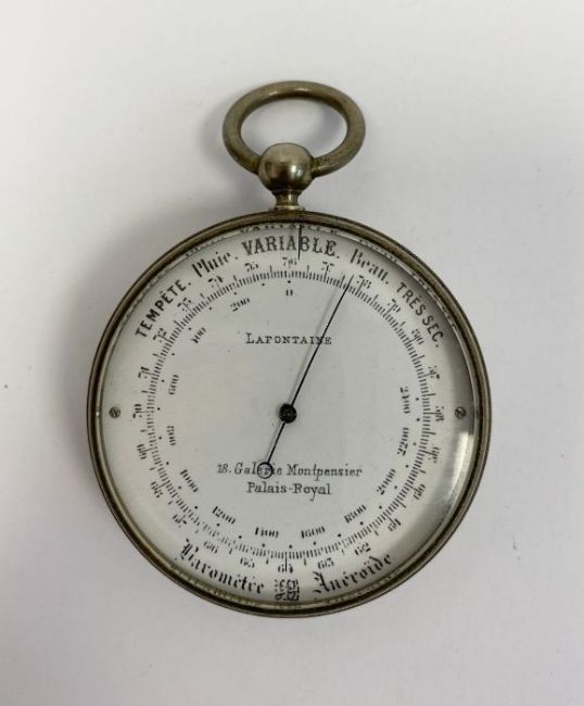 Late 19th century white metal cased French pocket aneroid barometer by La Fontaine, with white enamelled dial marked for Palais Royale, engraved with interlocking CH monogram to case, 5.2cm diam.