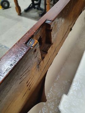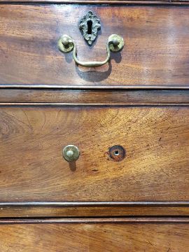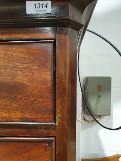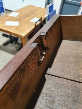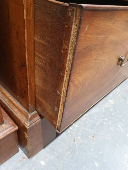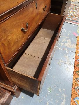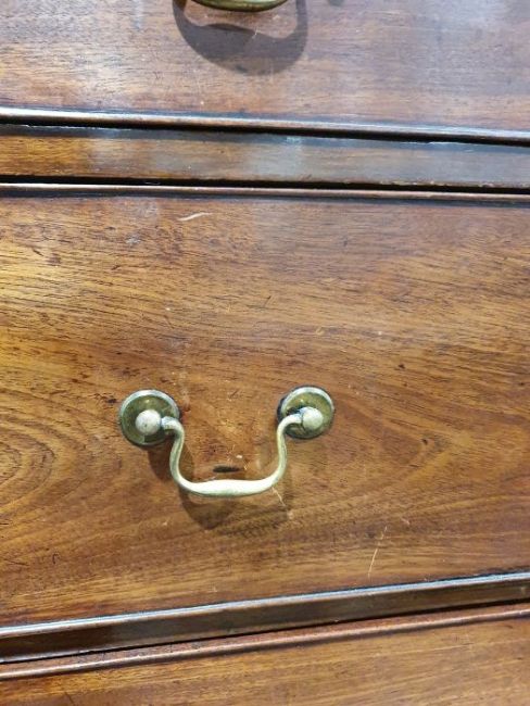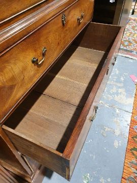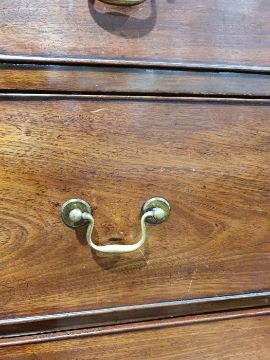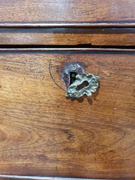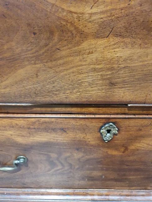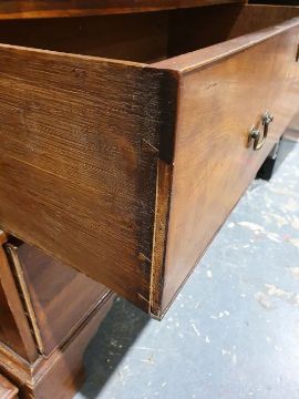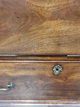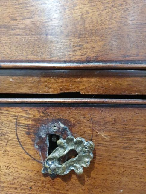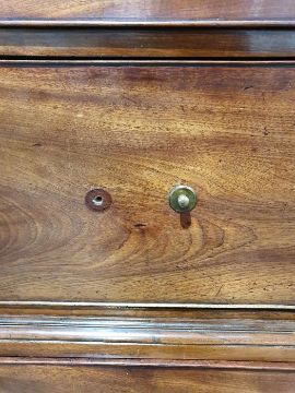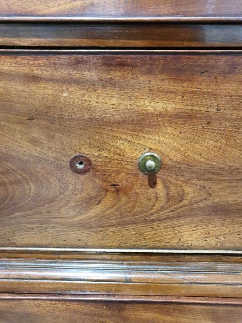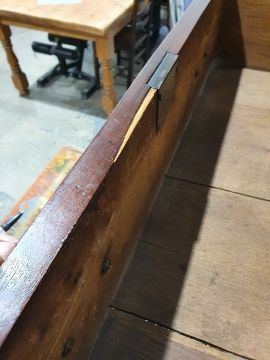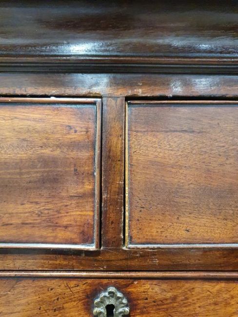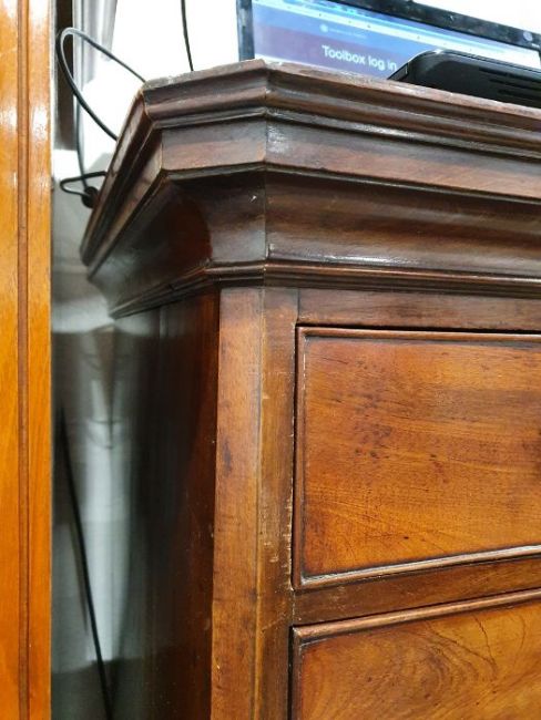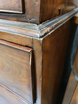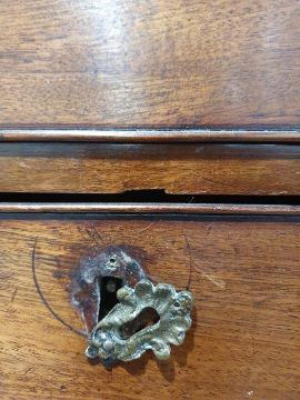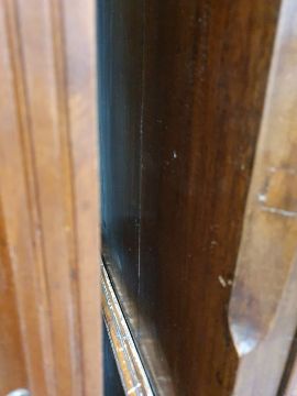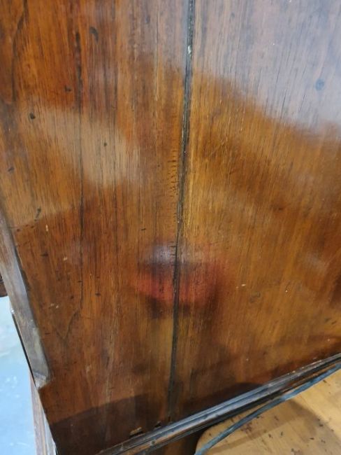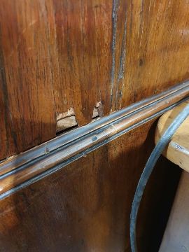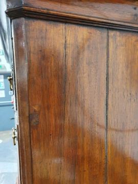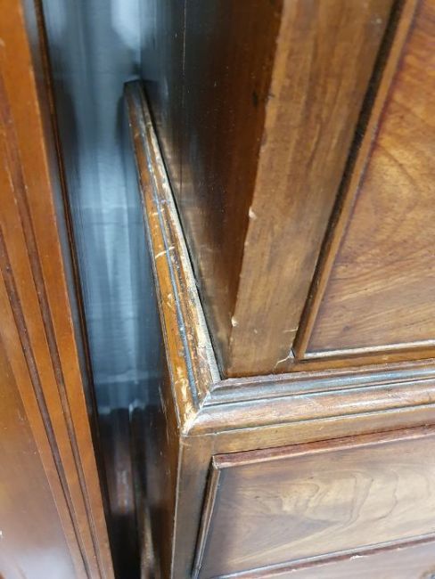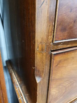 99cm from cornice edge to cornice edge. Surface scratches, scuffs and knocks to the wood. Areas of loss to the beading and an area on one of the sides. two locks missing, Escutcheon loose. Fading, discolouration and some staining. Some splits to the wood and repairs. General wear and tear.