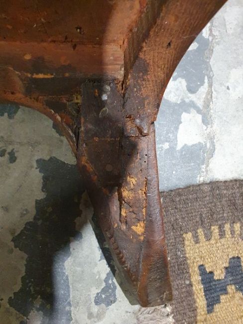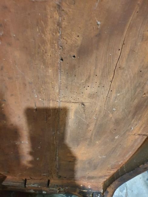 Surface scratches, scuffs and knocks to the wood. Splits to the wood, areas of loss to the beading, repairs and replacement sections on the legs, old worm to the underneath. Areas of fading, discolouration and staining. Possible replacement handles and locks. Areas of loss to the veneer. General wear and tear.