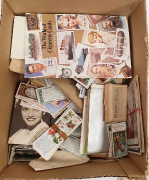Assorted cigarette cards to include tea cards from the English and Scottish Joint Cooperative Society Packet Teas, cigarette cards to include Ogdens, Wills, Typhoo tea cards, Caperns Bird Food cards, cigarette cards of the Channel Islands, an unused photo album, Cavenders Limited cards in an album, a small metal paint box with stencils and three prints (1 box)