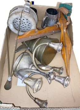 Two carved and painted wooden tribal masks, a pair of vintage ice skates, a carved elephant train on ebonised stand, brass, copper and pewter items and a box of mixed glass decanters, etc (2 boxes)