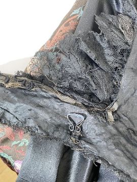 Victorian black beaded short cape with ribbon detail with corded and beaded fringe, a machine-embroidered satin quilted short cloak, hooded, satin covered buttons and fringe to the hood and similar to the front fastening and a Victorian bodice/jacket in black satin, faux jet front fastening, white bead embroidered detail to the collar (3) Condition ReportShort cape has occasional holes and repairs to lining. Frill border has holes as photographed. Thread loosening to the back. Wraparound band fastening of the left hand arm is torn as photographed. Jacket has repairs to the armpits, right hand cuff and front. Left hand cuff has a little wear. Bead buttons are occasionally loosening. The odd hole to the back as photographed. Cloak has occasional patches of wear to the satin externally. Cloak lining worn as photographed, with the odd stain and hole.