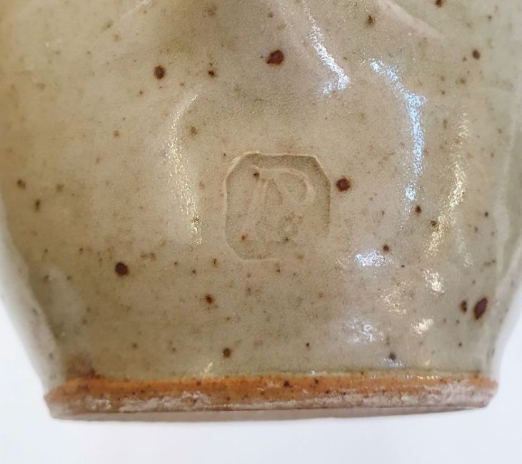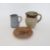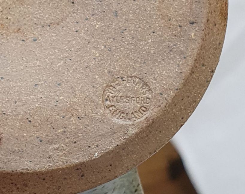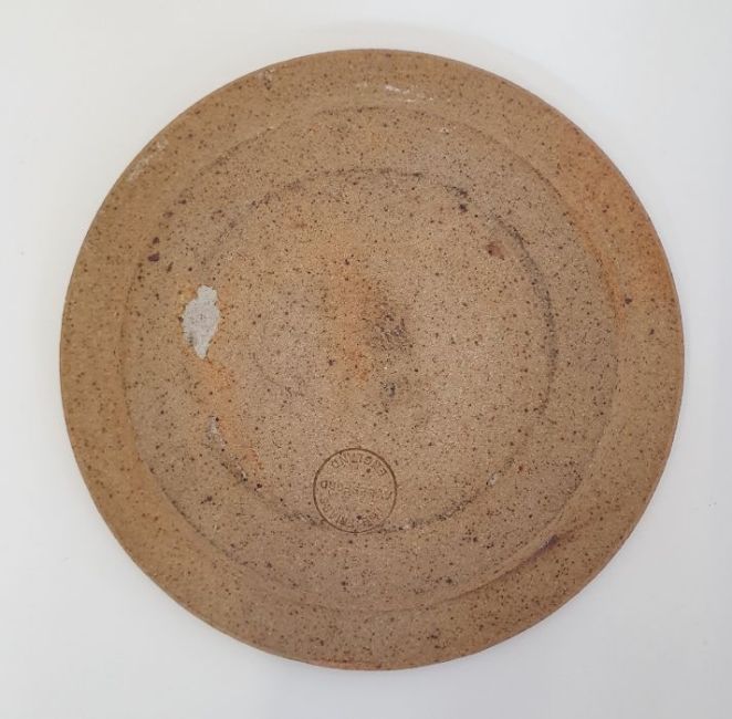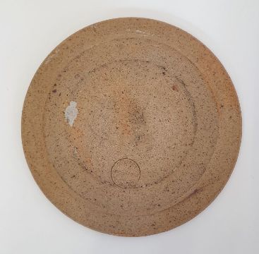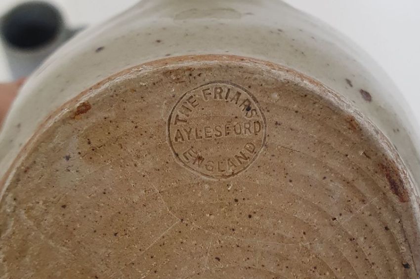 Three pieces of The Friars, Aylesford studio pottery to include a jug with tenmoku and oatmeal glaze, possibly by Colin Pearson, impressed marks to base (h.12cm),  a studio pottery jug with speckled lilac glaze, impressed mark to base (h.10cm) and a dish with applied central plaque inscribed "Saint Thomas", impressed marks to base. (3)
