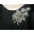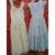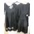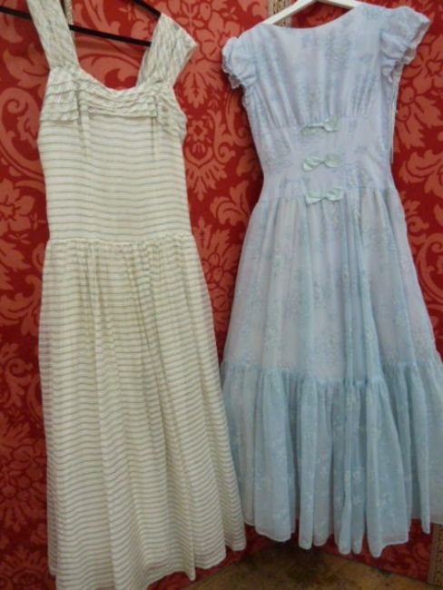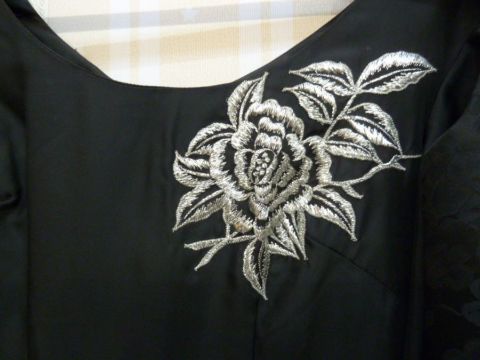 Various 1960's and 70's evening dresses to include a Flory Miami black damask sleeveless smock-type gown, a Festiva labelled size 38, 1960's evening dress, nylon, printed with green and gold stripes, pintucked bodice and strap sleeves, another Flory Miama black satin evening dress with silver embroidered silver to the left shoulder and to the hem, three-quarter length angel sleeves, a 1960's hooped evening dress with underskirt, deep flounced hem in pale blue printed with flowers, side zip, bow detail to the front and bow ribbon on the back and a Nettie Vogue of London black evening dress, hooped, tiered dropped waist, three-quarter length sleeves with lace detail, lace detail to the collar and a velvet bow and faux roses to the waist, scoop back (5)