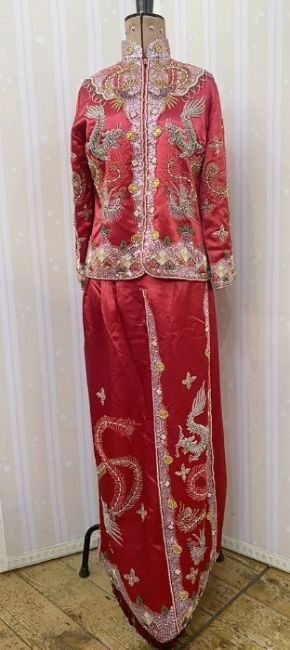 Modern Oriental style embroidered red satin full-length skirt and jacket, heavily embroidered with sequins, bugle beads and diamante in the shape of  dragons, flowers, etc.  the hem of the skirt is fringed, within a tin box