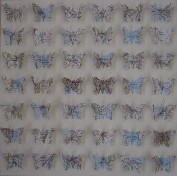 Cornish map paper cutouts in the shape of butterflies to include St. Ives, Land's End, Lizard, 29cm, framed and glazed
