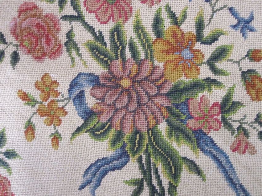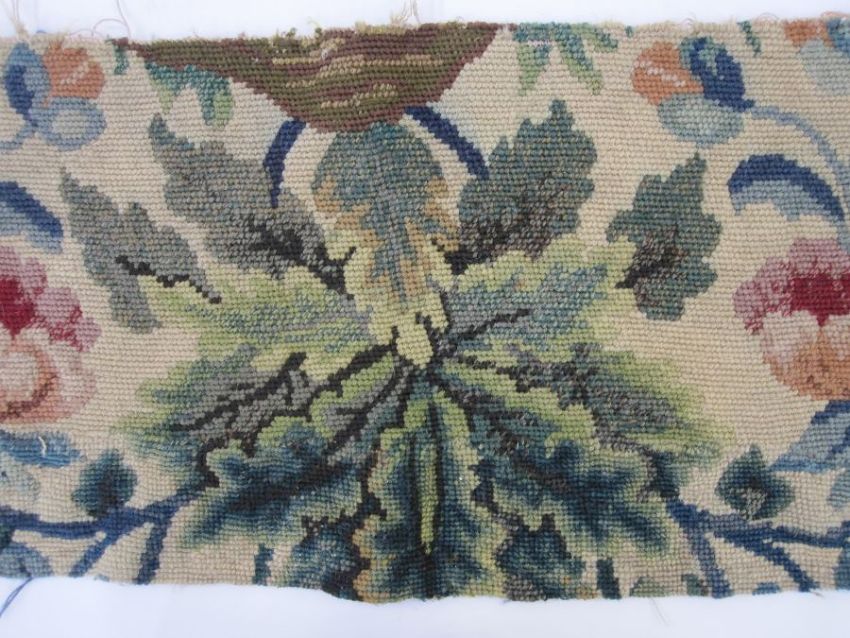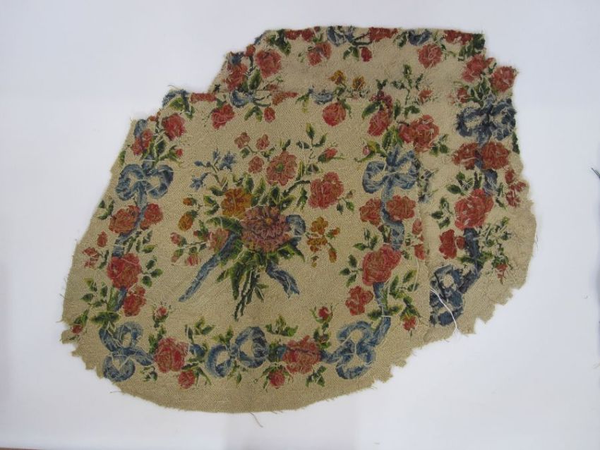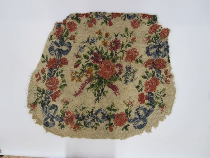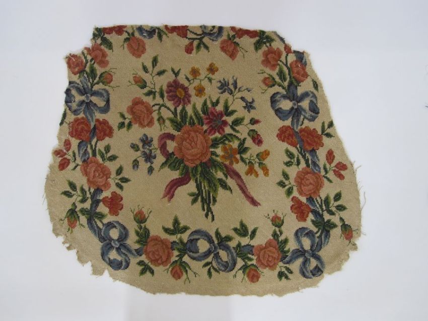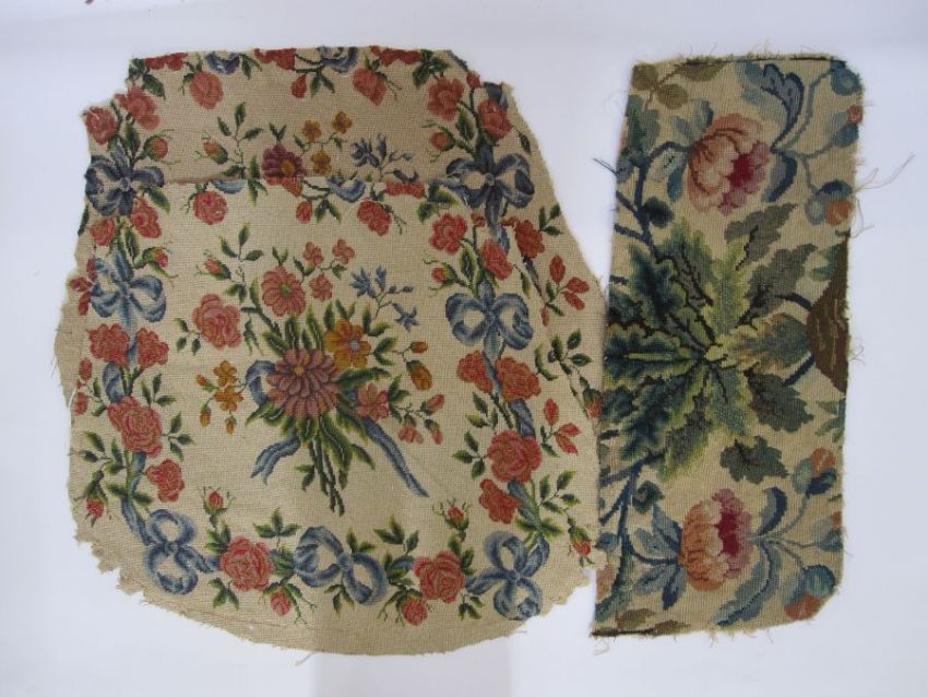 Two antique needlepoint tapestry chair covers with floral spray centrepiece surrounded by flowers, buds and ribbon bows in pink, red, orange, purple, green and blue (both slightly different) possibly Aubusson, approx cm together with a fragment of floral and oak leaf tapestry, approx 60cm x 25cm (3)